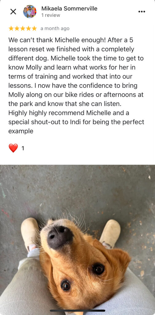 I cannot recommend Michelle highly enough. Michelle is the most knowledgable and caring trainer I have ever worked with. My dog Sadie absolutely adores her. We have worked with other trainers before, but Michelle has been the one that has truly made a difference with Sadie’s reactivity. I wish I knew Michelle when Sadie was a puppy, as I know our journey would have been very different.
